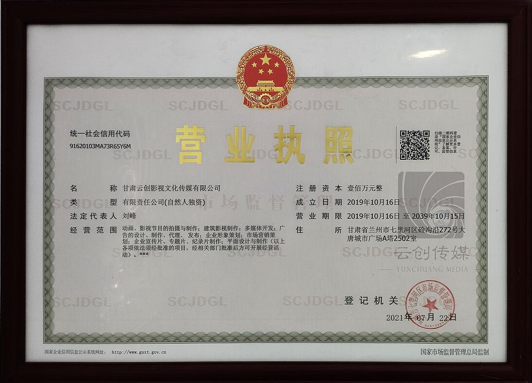 甘肅云創(chuàng)影視文化傳媒有限公司營業(yè)執(zhí)照